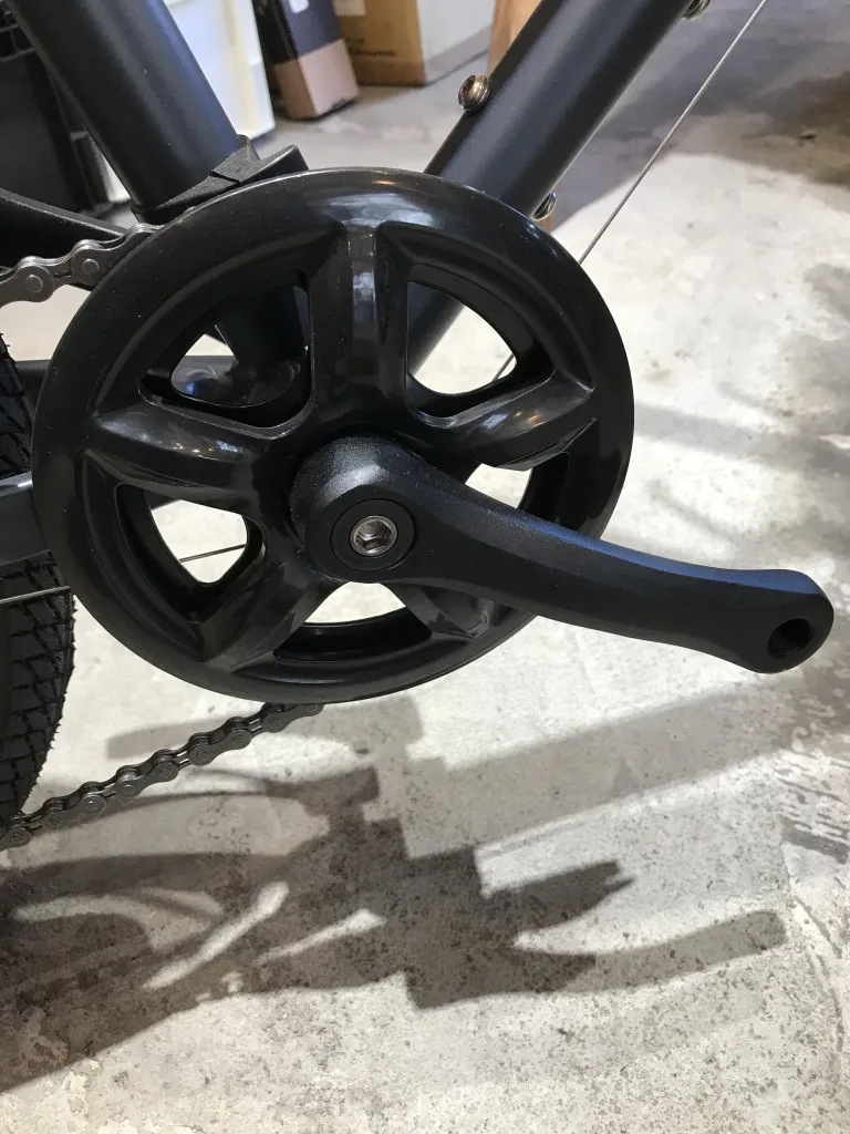 チェーンガード付きのクランクで裾の汚れや巻き込みも軽減されますよ〜